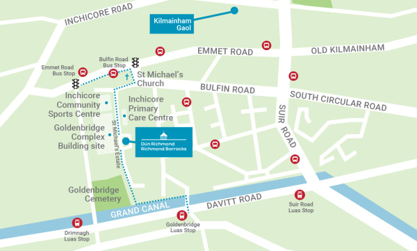 Richmond Barracks is located off Bulfin Road, corner of Emmet Road (R810), behind St. Michael’s Church. It faces St. Michael’s Estate green space, which is currently a building site.